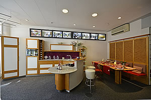 Ein ganz besonderer Reiz geht hier von außergewöhnlichen Tischen und Sitzbereichen aus: Besonders aufwendig und großformatig aus edlen Hölzern gearbeitet.